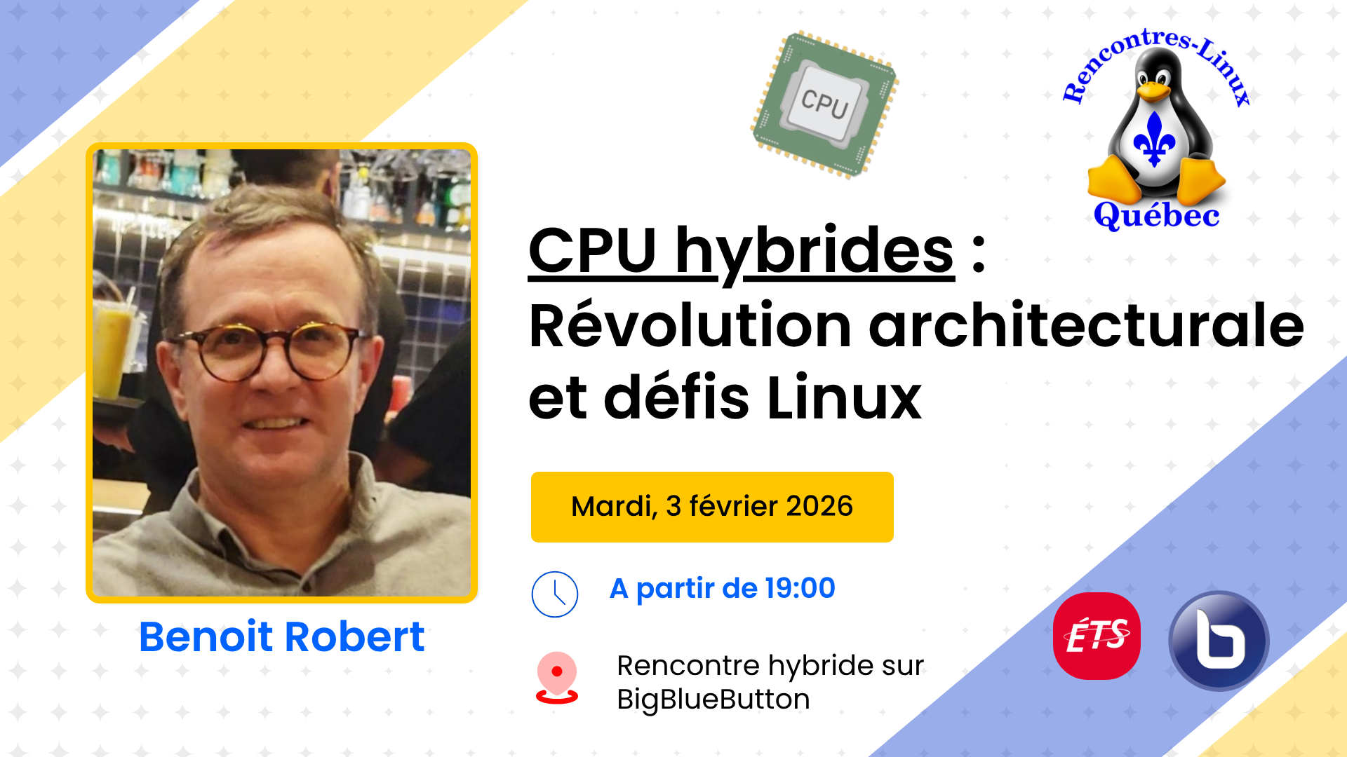 🏢 En présentiel : Resto-pub et à partir de 19:00 à la salle de l'ÉTS  (B-0904)